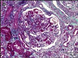 在肾脏病理中,在增厚的肾小球基底膜内可观察到泡沫样脂质沉积,导致空泡样外观。系膜区往往扩大,也可能出现泡沫样外观。电镜下,脂质沉积表现为肾小球基底膜内、鲍曼氏囊腔和内皮细胞中空泡化。脂质沉积的程度可能是进展至终末期肾病的一项重要预测指标。