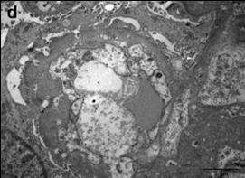肾活检结果:31 个肾小球中 13 个全球硬化。在内皮细胞和小动脉壁中观察到泡沫样外观。毛细血管内出现 PAS 染色阳性沉积物(图 b)。刚果红染色阴性。电镜下观察到基底膜内、内皮下和系膜区脂质沉积物(图 c),内皮细胞空泡化(图 d)。
