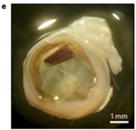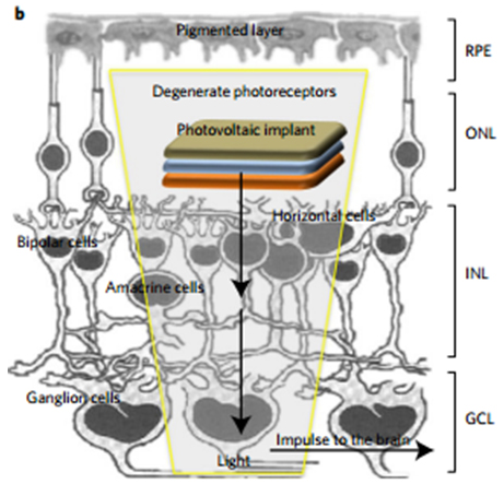 植入大鼠的人造视网膜而意大利的这个研究团队制作的人造视网膜分为三层,中间是用导电聚合物制作的一层薄膜,底衬丝织物,外覆半导体聚合物。这层半导体聚合物本质上是一种光伏材料,能吸收入眼的光子。然后,人造视网膜就会产生电信号以刺激视网膜神经元,接过受损的感光细胞原本的职责。