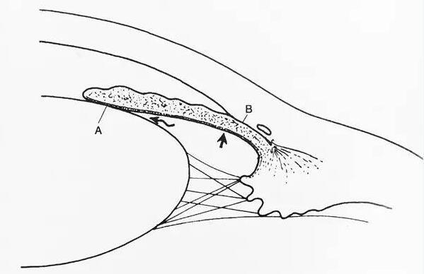 一般认为在虹膜的瞳孔部分与晶体前表面之间房水外流阻力增加,在瞳孔中等大时,两者之间的接触面积 (下图 A 处) 最大,虹膜对晶体的作用力也最大,瞳孔阻滞更为明显。