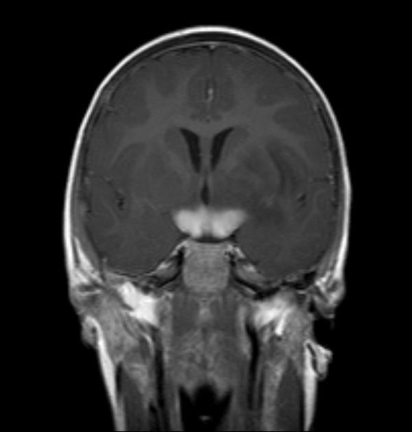图 2 MRI 检查,冠状位 T1WI 增强序列显示视神经交叉及双侧视神经走行区肿胀,呈明显强化改变