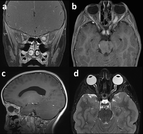 图 8 两例视神经胶质瘤影像学表现:a 和 b 为一例,双侧视神经肿胀,可见强化改变,累及视交叉;c 和 d 为另一例,可见左侧视神经迂曲改变,结果证实为视神经胶质瘤