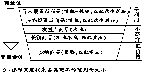 陈列原则:将门店最想销售的重点商品陈列在顾客一眼看到的地方——黄金货位。通过扩大重点商品的陈列面提升与顾客的见面几率和冲击力。对于影响利润提升的长销商品、竞争商品可以通过调整货位、缩小商品陈列面等措施,适当延长顾客为选择商品而在门店观察和逗留的时间,同时避免与重点商品“抢镜头”。但一定要保证此类商品有货,避免因缺少长销商品、竞争商品而影响客流量。