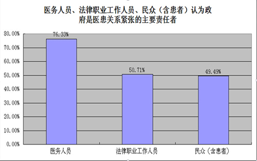 据调研分析,医疗纠纷产生的原因主要有三个方面,分别是来自政府、医疗机构和患者自身三个方面。一起医疗纠纷,三方面原因可能单独存在,也可能同时存在。在此次座谈会、问卷调查、网上调查等环节中,分别有76.33%的医务人员、50.71%的公、检、法、司、律师等法律职业工作人员和49.49%民众(含患者)认为政府部门应当是医患关系紧张的主要责任者。