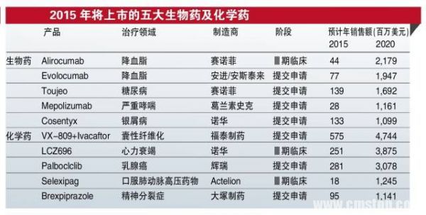 2015年上市药品的总价值将得益于那些重大且广泛涉足的治疗领域,如心血管和呼吸系统疾病,以及糖尿病和精神分裂症。高胆固醇和心力衰竭的治疗药物将成为这一年新药产品的主角,预计2020年的销售收入将达到80亿美元。