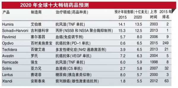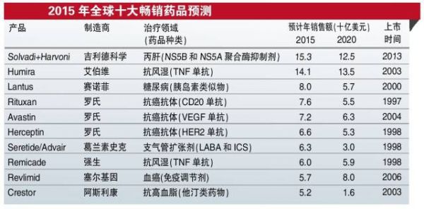 这份名单中,只有吉利德1年前刚上市的抗丙肝病毒新药Solvadi可以被归为新上市药品。该药以惊人的增长速度夺取市场,直奔销售冠军宝座。若作为单个产品计算,Solvadi明年销售额可能将会排在修美乐(Humira)之后。