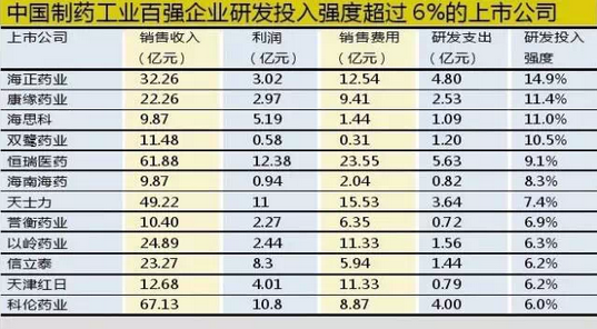 上市企业由于信息披露较为公开,更具参考价值。根据CFDA南方医药研究所的中国制药工业百强榜,上市公司已经占据了绝大多数。因此,我们筛选出部分国内上市公司、核心业务为药品(不含原料药)、研发投入强度超过6%的百强企业。根据公开数据,梳理其新药研究进展,分析其研发思路。
