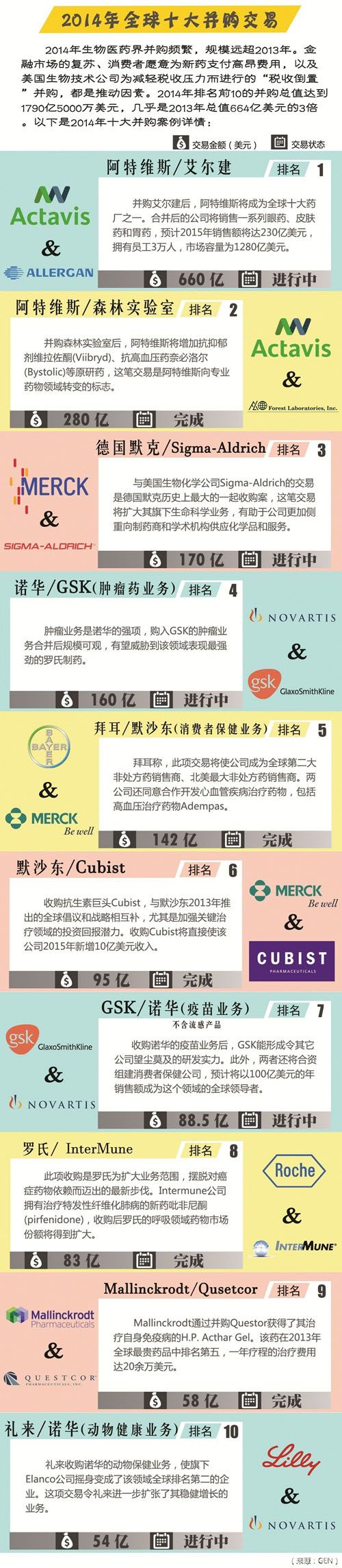 2014年制药行业的并购案数量没有增加,但并购总额总却高达2120亿美元。近日发表的一篇分析文章揭示了并购金额飙升的原由。显然,阿特维斯出力不少,其两桩大收购案——艾尔建与森林实验室的并购金额分别高达660亿美元和280亿美元。此外,诺华与葛兰素史克之间230亿美元规模的资产互换交易也在并购总额中占了较大比例(诺华以160亿美元收购了葛兰素史克的抗肿瘤药物业务,葛兰素史克以70亿美元收购了诺华除流感疫苗之外的疫苗业务)。