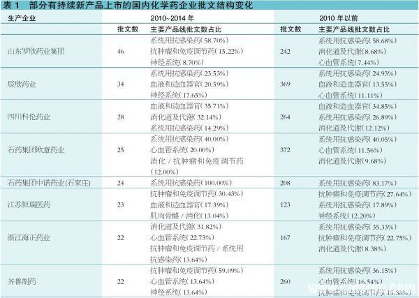 此外,对有持续新产品上市的国内化学药企业2010年以前的产品批文进行结构分析(表1)可知,系统用抗感染药占比基本都在20%以上。2010年以前,系统用抗感染药规模大、增长快,营销成本不高,利润回报周期短,是不少药企研发的重点。