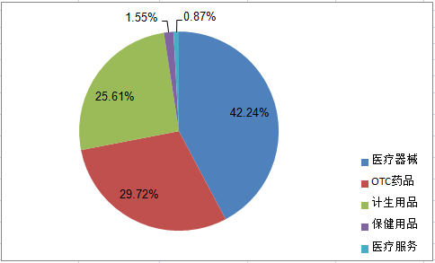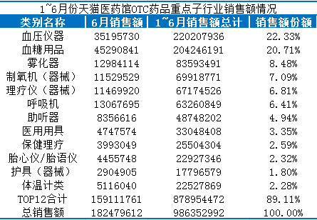 天猫医药馆6月份医疗器械、OTC药品、计生用品、保健用品及医疗服务五大类目共完成销售额4.32亿元。其中,医疗器械销售额份额为42.24%,OTC药品份额为29.72%。