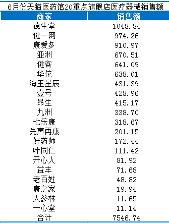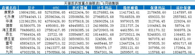 观察旗舰店在不同类目上的销售情况可发现,康爱多OTC药品和计生用品的老大地位难撼,在两大类目上的销售额均过千万,并且是药房旗舰店中唯一一家在这两个类目中销售额过千万的商家。而医疗器械6月份的冠军之位易主,德生堂抢夺第一,华源排名由5月份的第一降至第二。