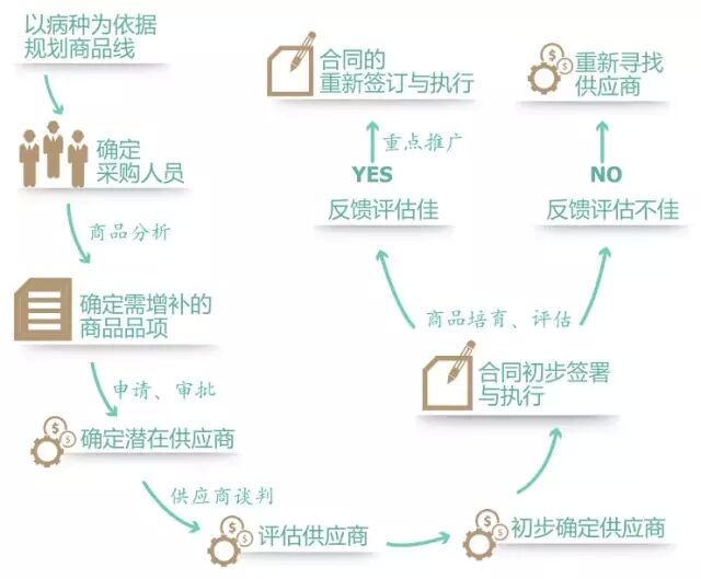 要想规范采购行为,必须要有流程作为保障。基于按病种设置商品线的策略及相应的采购分工,可制定如下采购流程(如下图)。