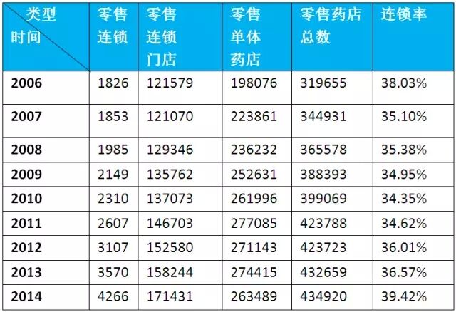 第一药店财智梳理了CFDA官网上从2006-2014年的统计年报(详见下表),发现2006-2009年,连锁企业数量和门店数虽然保持增长趋势,但增幅很小。