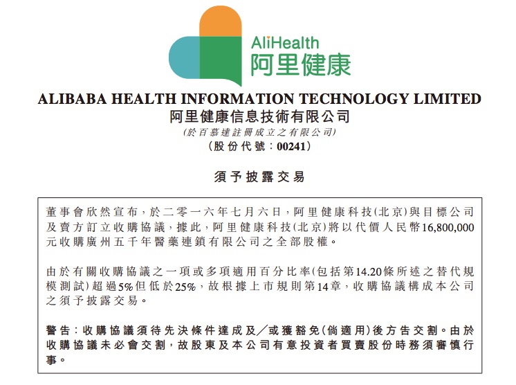 阿里健康宣布,该公司于2016年7月6日同五千年医药连锁以及卖方签订收购协议,将以人民币1680万元为代价收购五千年医药连锁全部股权。