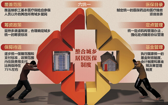 年初,国务院印发文件,决定整合城镇居民基本医疗保险和新型农村合作医疗两项制度,建立统一的城乡居民基本医疗保险制度,实现覆盖范围、筹资政策、保障待遇、医保目录、定点管理和基金管理的“六统一”。