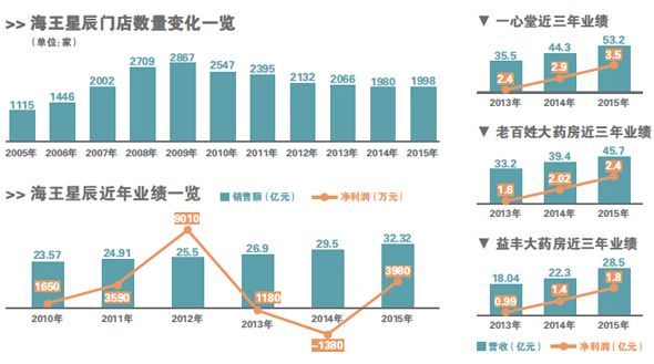 在最新零售药店排行榜前五名中已经不见海王星辰的踪影。据2015-2016年度中国连锁药店综合实力百强榜显示,前五位的药店为国大药房、一心堂、大参林、益丰和老百姓大药房,海王星辰位列第七。在2010-2011年度中国药店排行榜中海王星辰位居榜首之位,从榜首之位到五强之内不见踪影,这五年对海王星辰来说如同坐上过山车。