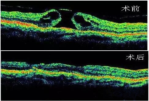6、板层黄斑裂洞:在裂洞底部仍可见到部分神经上皮及色素上皮的反射。