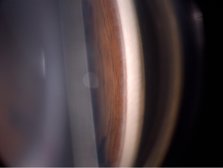 6. 用条状裂隙光线与角膜成10°-20°方向投照,因为光带是通过镜面反射到对 侧房角上的,故镜面所反映的房角形态与实际位置相反。房角镜旋转一周,整个房角的情况可顺次看清。观察内容包括房角的结构、宽窄度、开与闭,以及有无粘连、新生血管、异物或肿块等。