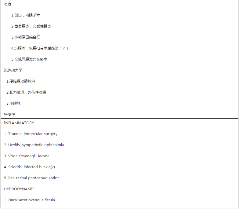 渗出性脉络膜脱离可以由多种情况导致(表1),包括内眼术后低眼压,巩膜扣带术后,巩膜炎等。此外,也可在健康成人无明显原因情况下发生单眼或双眼自发性脉络膜脱离。此种情况称为特发性脉络膜渗漏综合征。在这类患者可能存在如下情况:表层巩膜血管扩展,Schlemm管内见血性液,眼压可以正常,可见少量玻璃体细胞,视网膜下液随体位改变的非孔源性视网膜脱离,视网膜下液中蛋白含量可以超过正常血清浓度二至三倍,脑脊液蛋白升高(见于半数病人),临床过程迁延,病情可自行缓解或加重,对皮质类固醇、抗代谢药物及放液和巩膜扣带等治疗无明显反应。