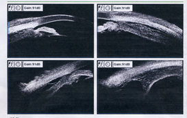 Fig 4 UBM showed circumferential ciliary body edema and a localized ciliary cyst in the temporal-superior part. No echo sound was detected inthe cavity.
