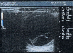图2 B超:右眼视网膜脱离,脉络膜脱离?