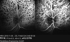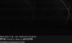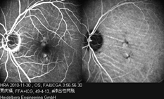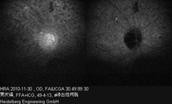 Right eye: The dye transit was slightly retarded. There were multiple round-shaped, well demarcated hypofluorescence spots in the posterior portion of the retina, with no staining in the late phase. The margin of the optic disc wasblurred and was hyperfluorescen in the late phase. In ICGA, the hypofluorescence spots remained unchanged from the beginning to the end.