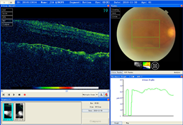 Fig3 CDI showed a Y-shapedstrip with rich blood supply connecting to the optic papilla. In the temporal region. There was a semicircular bulge with a base of 20.75px×12px.Blood flow signals were not visible on the surface of the bulge, and was continuous with the uplift of the posterior pole at the base margin.