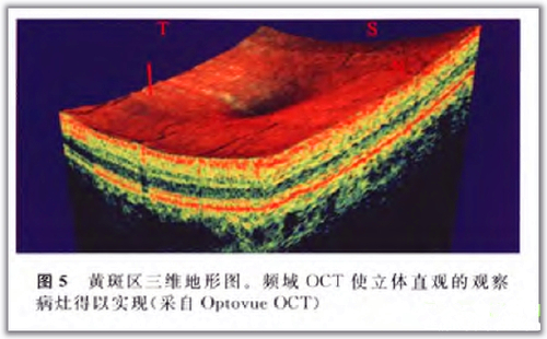 正常黄斑区OCT图像中,必须了解黄斑区横断面图像特征。频域OCT的黄斑图像非常接近黄斑的组织形态学水平,所以熟悉正常黄斑形态(图3)及组织结构,将有助于认识黄斑区的OCT图像特征。OCT图像中,黄斑区正常整体轮廓包括剖面图(图4)、地形图(图5)和平面图(图6)。黄斑中心凹处因只有光感受器细胞层,视网膜极薄,中心微凹呈斜坡状,为较低的光反射很易辨认。视网膜的主要动脉和静脉位于RNFL,位于其中的动静脉在OCT上难以清晰显示,但可以看到其后的影缺现象(shadow effect)(图7)。