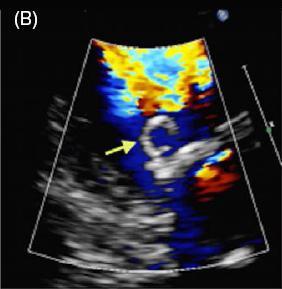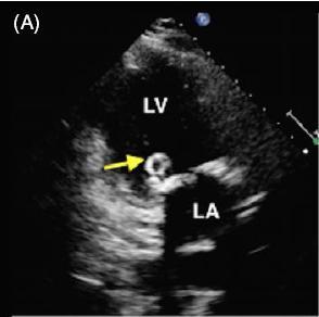 图 A 经胸超声心动图显示二尖瓣后叶可见一囊状结构,可活动