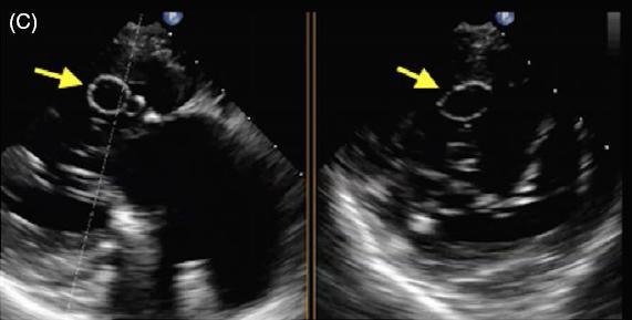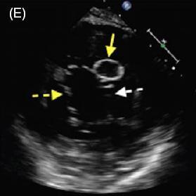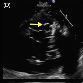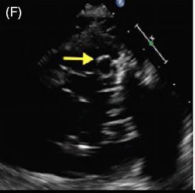图 C~F 二维经食管超声心动图显示一柔软的圆形结构附着于二尖瓣后叶,活动性良好
