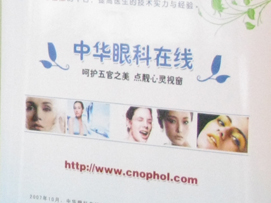 中华眼科在线(www.cnophol.com),由武汉五景药业主办,北京金鼎盛世医学传媒机构负责运营,国家医学教育发展中心提供学术支持。中国眼科第一门户,网站分为大众、专业、时尚、疾病四个频道。设有在线咨询栏目,更快更专业的回复眼科提问,拥用更完善的眼科医生、眼科医院、眼科药品数据库。眼睛保健知识大全,时尚眼妆美容。是眼科专业与眼科大众完美结合的综合性眼科网站。 |